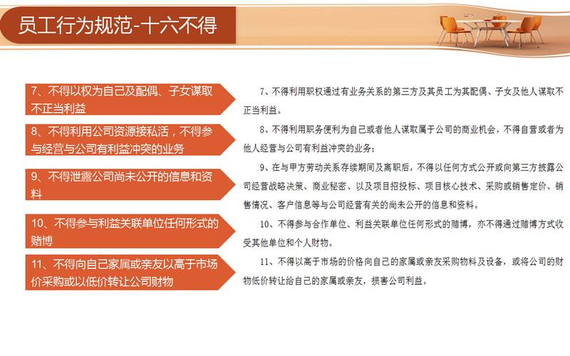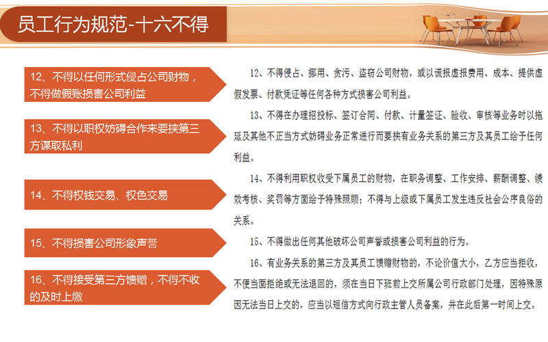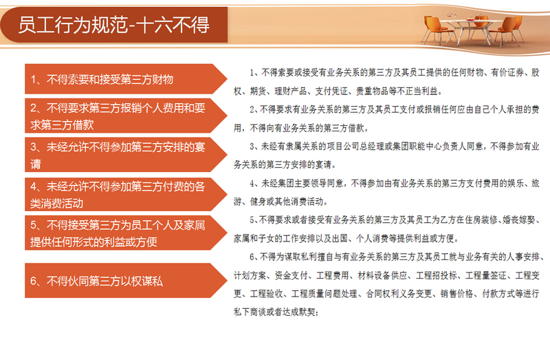 宣講環(huán)節(jié)主要從四個(gè)方面著手:分別為“目的、行為規(guī)范約定、違約責(zé)任與管理和連帶責(zé)任”。員工需要從十六方面規(guī)范自身的行為,包括不得索要和接受第三方財(cái)物、不得要求第三方報(bào)銷個(gè)人費(fèi)用和要求第三方借款、未經(jīng)允許不得參加第三方安排的宴請(qǐng)等等。